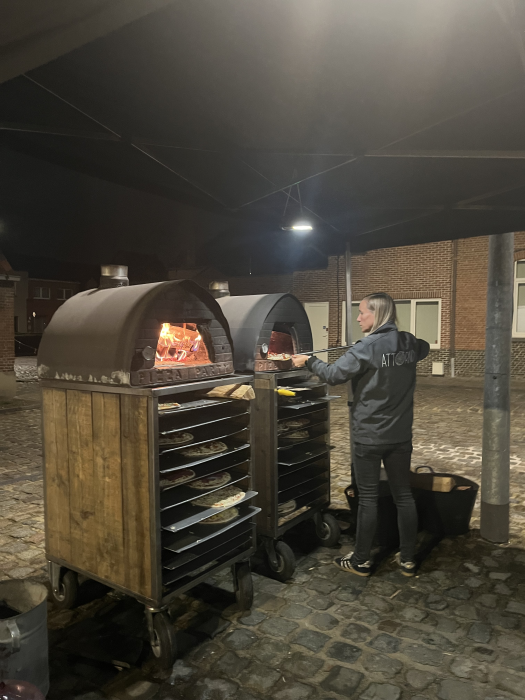 Wij plaatsen de houtoven, als je dat wenst, zo dicht mogelijk bij de genodigden. De pizza’s worden versneden en aangeboden aan onze mooi uitgestalde buffettafel. Op de tafel plaatsen wij kartonnen bordjes, verse kruiden en oliën, servetten. Het bakken en verdelen van de pizza’s neemt 1,5 à 2 uur in beslag.