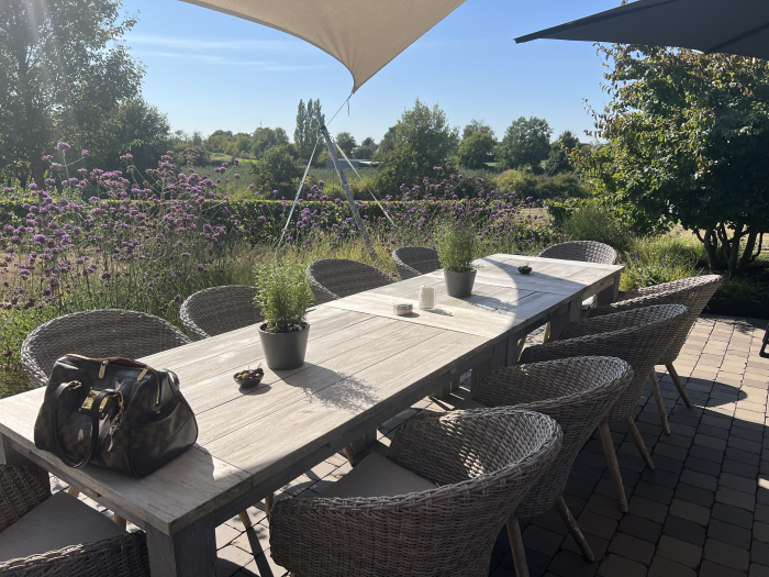 - Terras [?] Groot terras aan zuidkant met uitzicht over de vallei. Het kleiner terras is van maart tot oktober overdekt met een stretchtent.