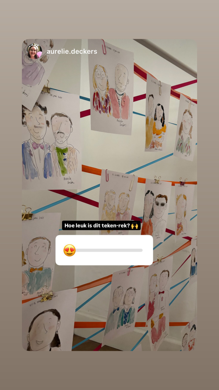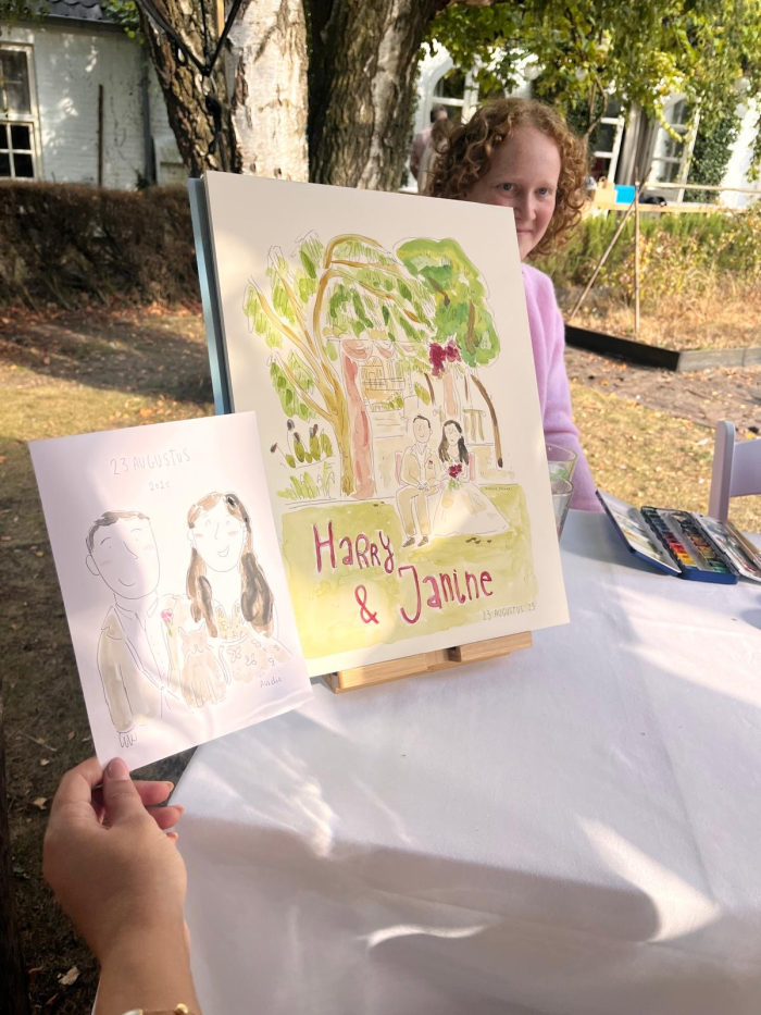 Tijdens het tekenen ontstaat er een bijzondere sfeer: gasten kijken nieuwsgierig toe hoe hun portret langzaam tot leven komt. Het zorgt voor een gezellige, interactieve en zelfs wat magische ervaring. Mijn stijl is vrolijk, warm en speels – perfect om de sfeer van het feest te versterken en jouw gasten zich écht speciaal te laten voelen.