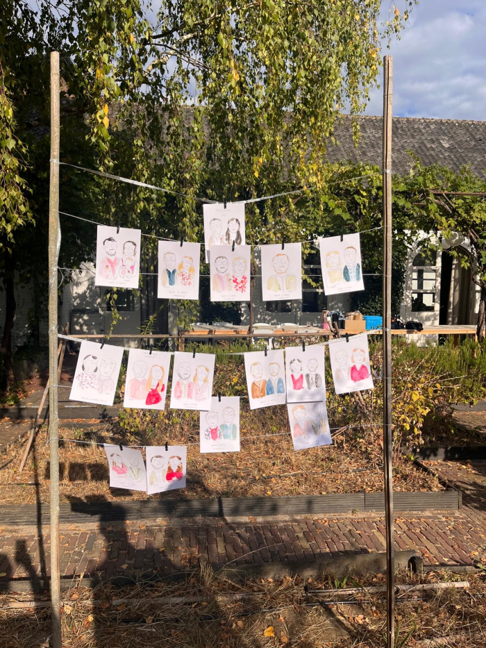 Ik teken op locatie vanaf een vaste plek. Het enige wat ik nodig heb is een tafeltje, drie stoelen en voldoende verlichting. De activiteit is geschikt voor zowel binnen als buiten. Ik werk op stevig A5-waterverfpapier met zwarte inkt en waterverf, en elk portret krijgt een mooie envelop mee. Gasten kunnen solo of per twee afgebeeld worden. Gemiddeld teken ik 8 à 10 portretten per uur.